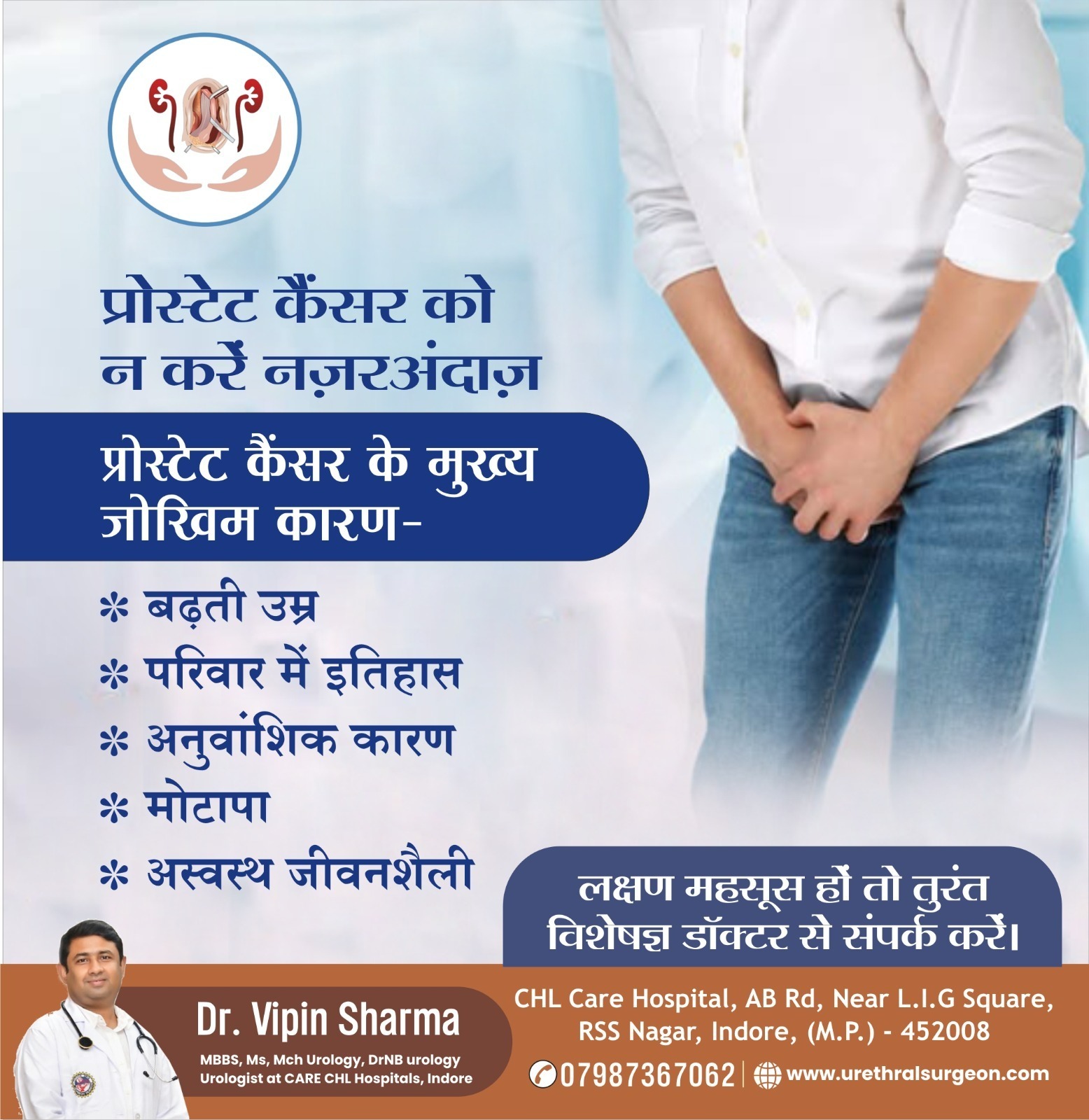 इंदौर में प्रोस्टेट कैंसर के डॉक्टर| क्या आप इंदौर में प्रोस्टेट कैंसर के लिए एक अनुभवी डॉक्टर की तलाश कर रहे हैं? डॉ. विपिन शर्मा से परामर्श लें, जो उन्नत और सहानुभूतिपूर्ण कैंसर उपचार के लिए जाने-माने विश्वसनीय विशेषज्ञ हैं। प्रोस्टेट कैंसर को नज़रअंदाज़ न करें—प्रारंभिक पहचान से उपचार के परिणाम और जीवन की गुणवत्ता में काफी सुधार हो सकता है। प्रोस्टेट कैंसर के मुख्य जोखिम कारकों में बढ़ती उम्र, पारिवारिक इतिहास, आनुवंशिक कारण, मोटापा और अस्वस्थ जीवनशैली शामिल हैं। इन कारकों को पहचानना और समय पर चिकित्सा सलाह लेना प्रभावी प्रबंधन के लिए आवश्यक है। डॉ. विपिन शर्मा, इंदौर के सर्वश्रेष्ठ मूत्र रोग विशेषज्ञ, सटीक निदान, आधुनिक उपचार विकल्प और प्रत्येक रोगी की स्थिति के अनुरूप व्यक्तिगत देखभाल योजनाएँ प्रदान करते हैं। रोगी-केंद्रित दृष्टिकोण और उन्नत चिकित्सा सहायता के साथ, वे हर चरण में व्यापक देखभाल सुनिश्चित करते हैं। आज ही अपने स्वास्थ्य की जिम्मेदारी लें। यदि आपको कोई लक्षण दिखाई देते हैं या आप जोखिम कारकों के अंतर्गत आते हैं, तो बिना देरी किए किसी विशेषज्ञ से परामर्श लें। समय पर कार्रवाई प्रोस्टेट कैंसर के उपचार और रिकवरी में जीवन रक्षक अंतर ला सकती है।